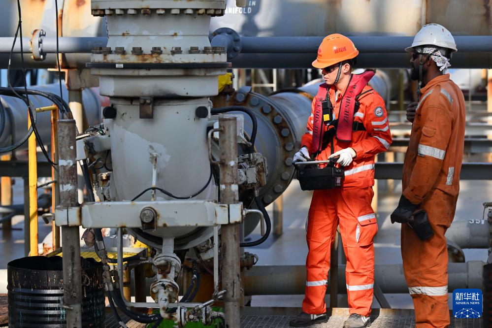 12月18日,装载着石化原辅料的船舶抵达洋浦港后,国投洋浦油储码头工作人员(左)和船舶外籍船员在进行卸油作业。