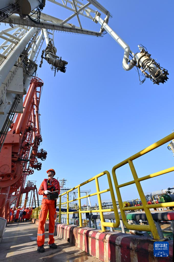 12月18日,装载着石化原辅料的船舶抵达洋浦港后,国投洋浦油储码头工作人员进行卸油作业。