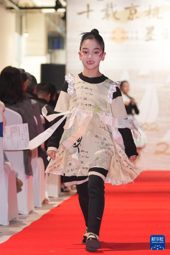 12月19日,杭州市育才京杭小学学生在展示书法创意服装。