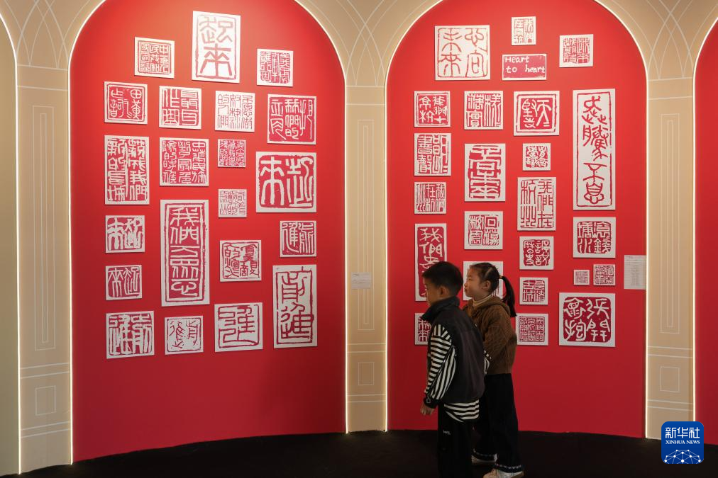 12月19日,小朋友观看杭州市育才京杭小学毕业生篆刻作品。