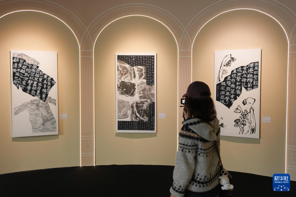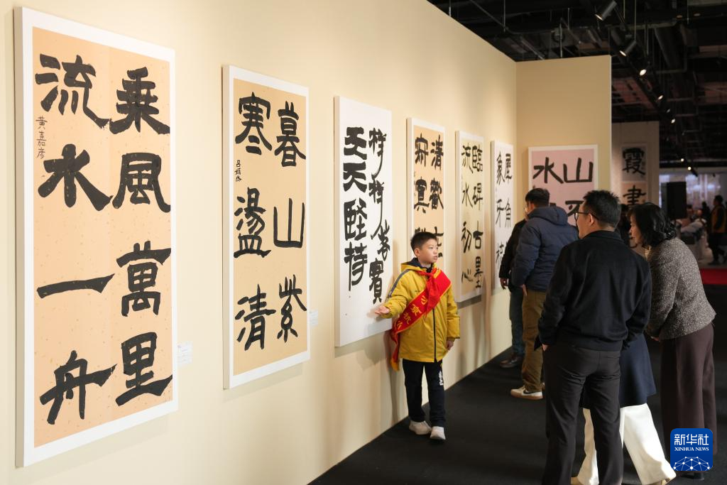 12月19日,观众观看小学生“分行布白”系列书法作品。