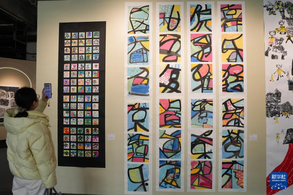 12月19日,观众观看小学生“画文解字”系列书法作品。