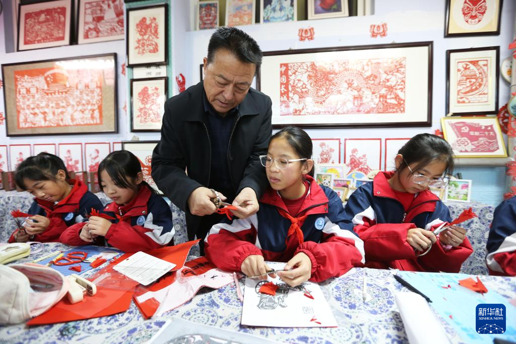 12月17日,在甘肃省定西市安定区福台小学,非遗项目定西剪纸代表性传承人付忠民为学生传授剪纸技艺。