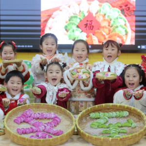 12月18日,浙江省湖州市德清县乾元镇第一幼儿园小朋友在包饺子。