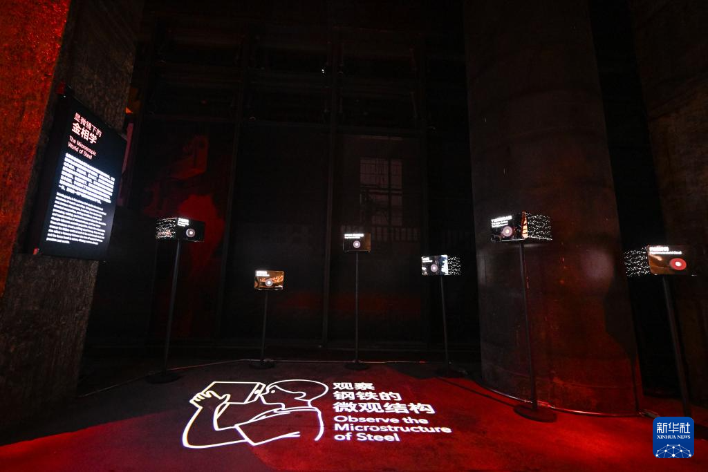 这是12月18日在首钢园三高炉拍摄的“钢铁时代”沉浸展中观察钢铁微观结构的互动装置。