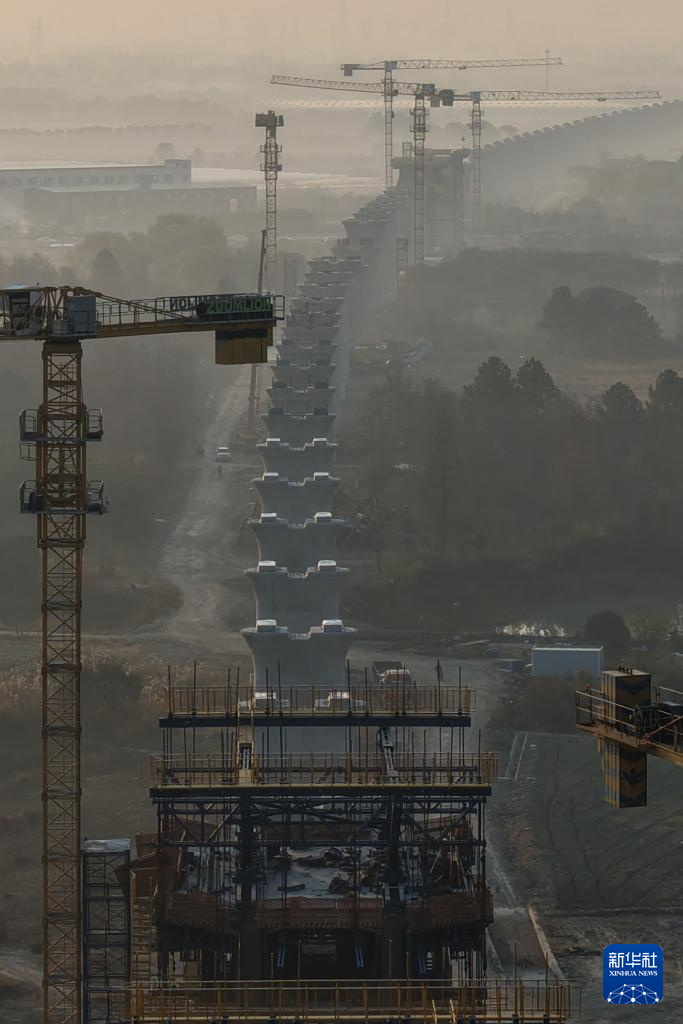 12月20日清晨拍摄的通甬高铁嘉兴特大桥施工现场(无人机照片)。