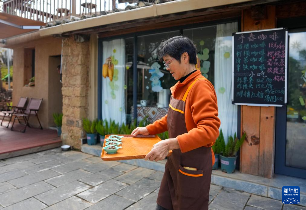 12月20日,来自四川的旅居客赵发英在曼海村自己开的咖啡书吧内为游客服务。