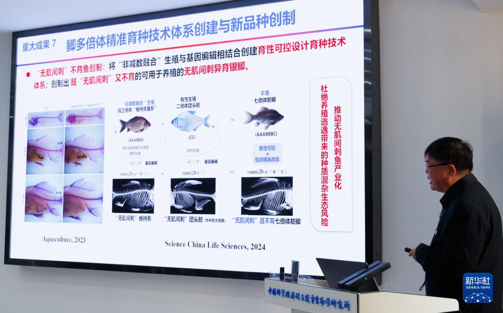 12月22日,在中国科学院遗传与发育生物学研究所举行的发布会上,中国科学院院士、中国科学院水生生物研究所研究员桂建芳在介绍研究成果。