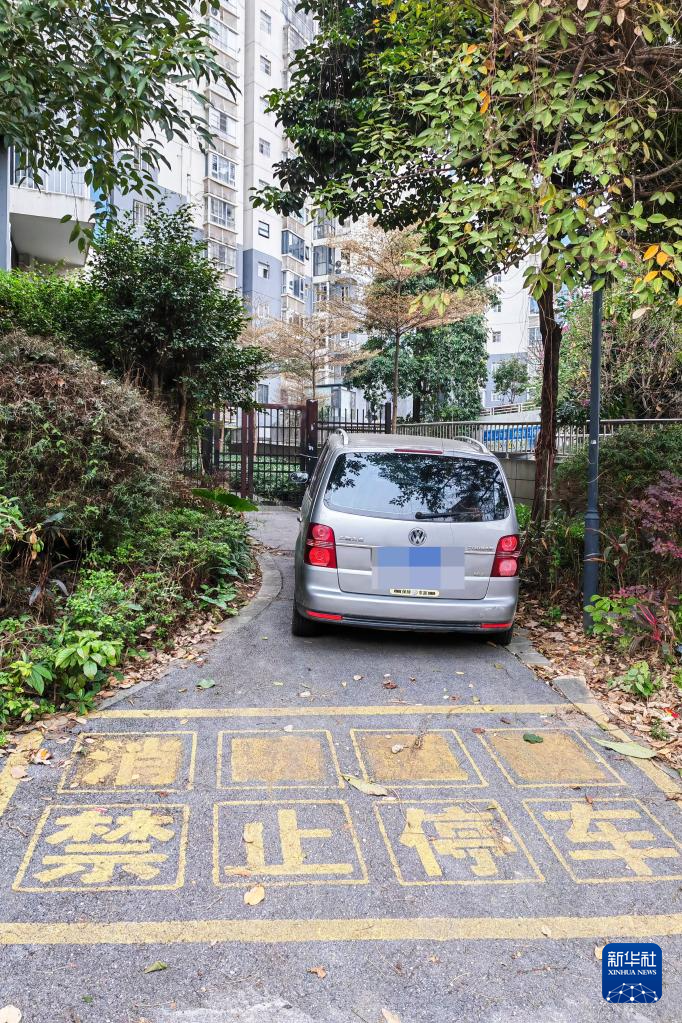 在四川某市一小区,两辆机动车停放在楼栋单元门前占用疏散通道(12月5日摄)。