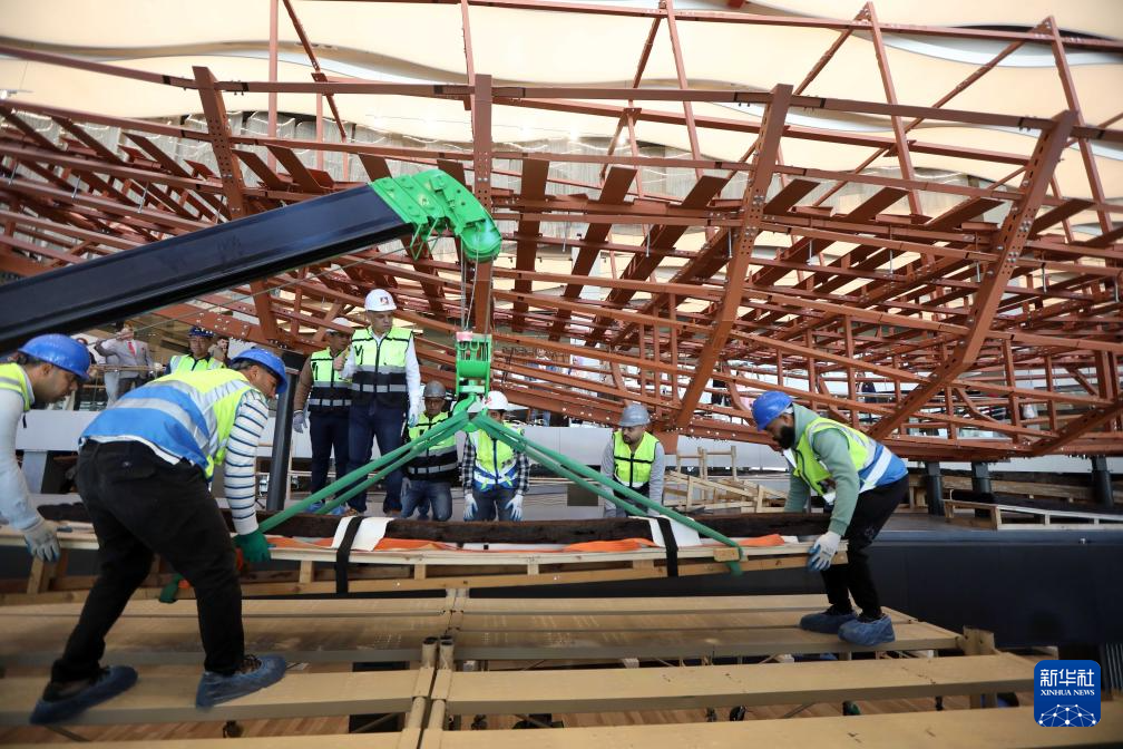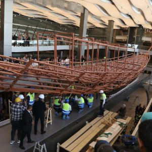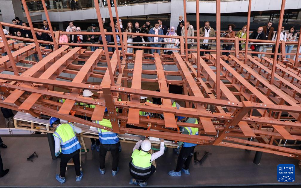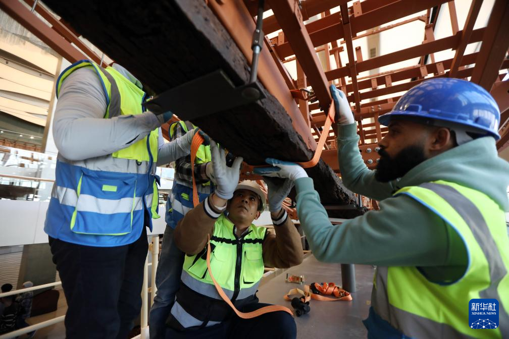 12月23日,在埃及吉萨的大埃及博物馆胡夫太阳船展厅内,埃及修复团队开展古埃及法老胡夫第二艘太阳船的组装工作。