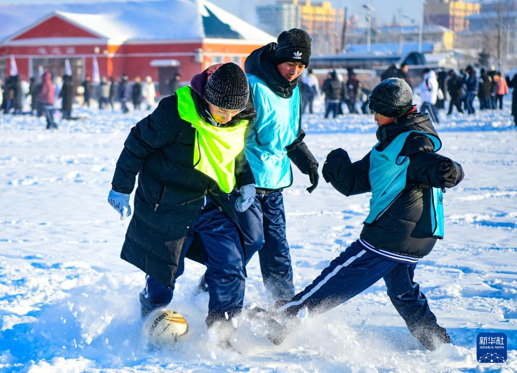 12月24日,呼伦贝尔额尔古纳市第二中学学生参加雪地足球赛。