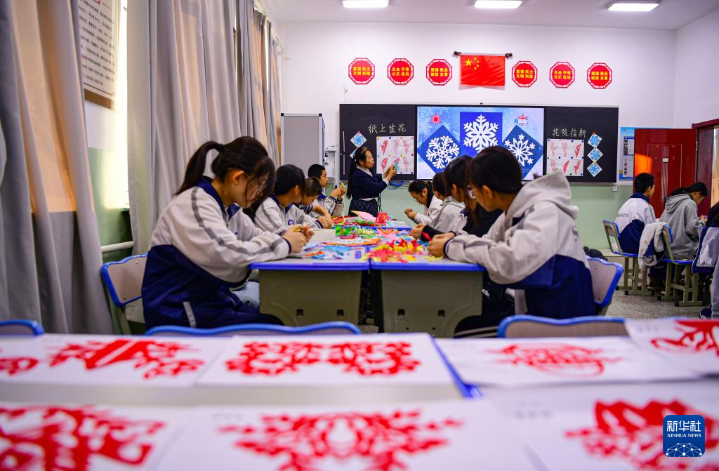 12月24日,呼伦贝尔额尔古纳市第二中学学生学习冰花剪纸。
