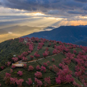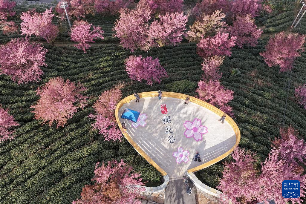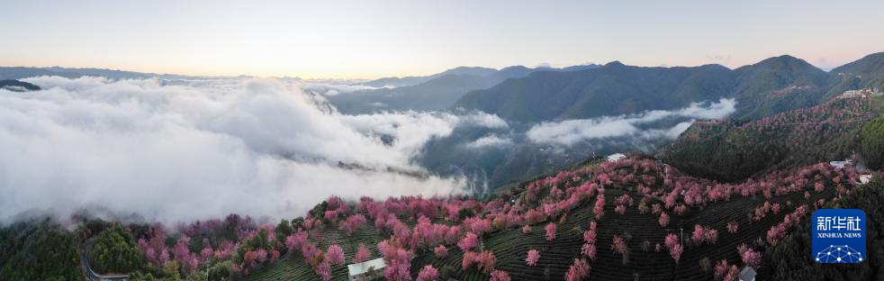 进入12月,云南省大理白族自治州南涧彝族自治县无量山樱花谷的冬樱花陆续绽放,与茶园、云海构成一幅美丽的山水画卷。