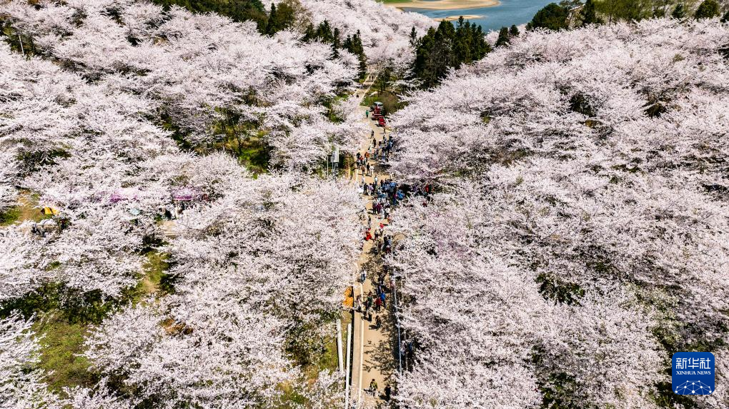 3月26日,游客在贵州省贵安新区樱花园内赏花游玩(无人机照片)。