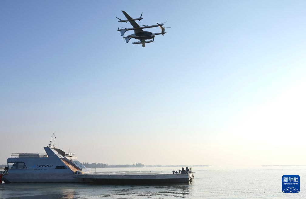 11月22日,在江苏昆山的峰飞航空全球科技日活动中,一架电动垂直起降飞行器从“水上机场”起飞。