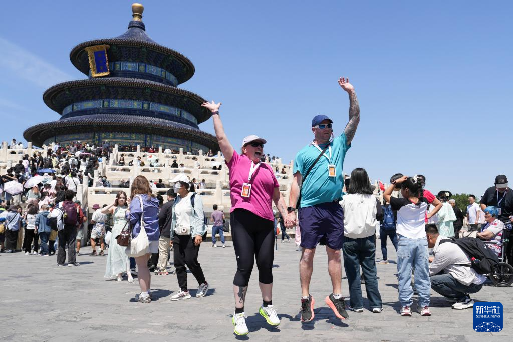 5月1日,来自澳大利亚的游客在北京天坛公园祈年殿前留影。随着我国持续优化免签政策,越来越多的外国游客来华旅游,“China Travel”热度持续提升。