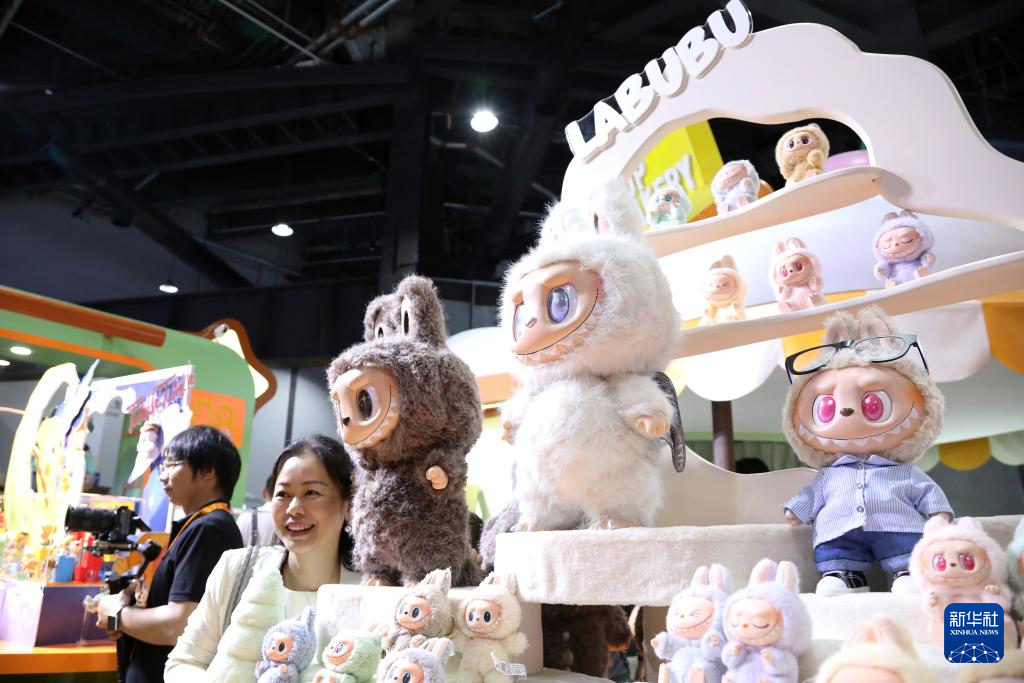 9月10日,在2025年服贸会上,参会人员在泡泡玛特展台与LABUBU玩偶合影。