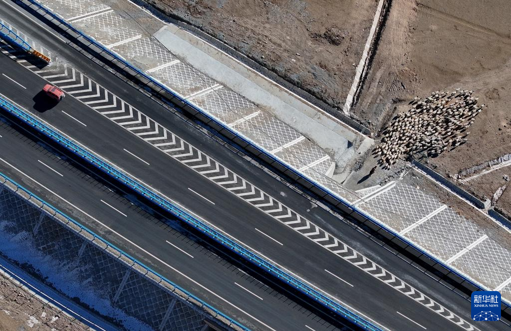 在新疆和静县,牧民赶着羊群从乌尉高速公路路基下穿过(12月23日摄,无人机照片)。