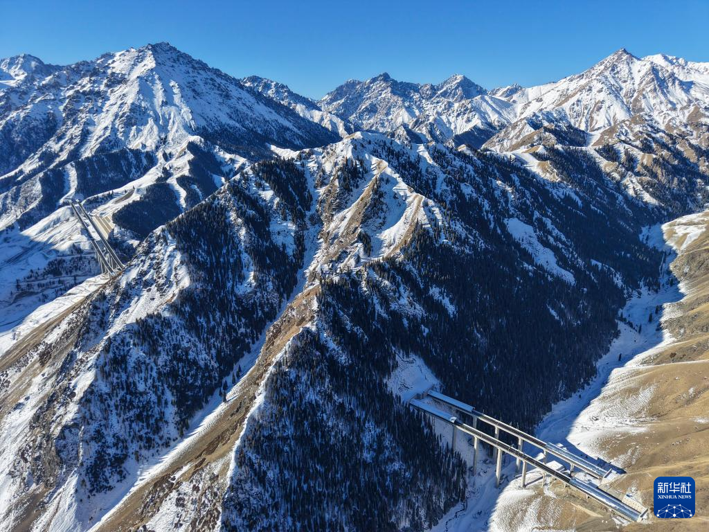 桥隧相连的乌尉高速公路穿越天山山脉(12月23日摄,无人机照片)。