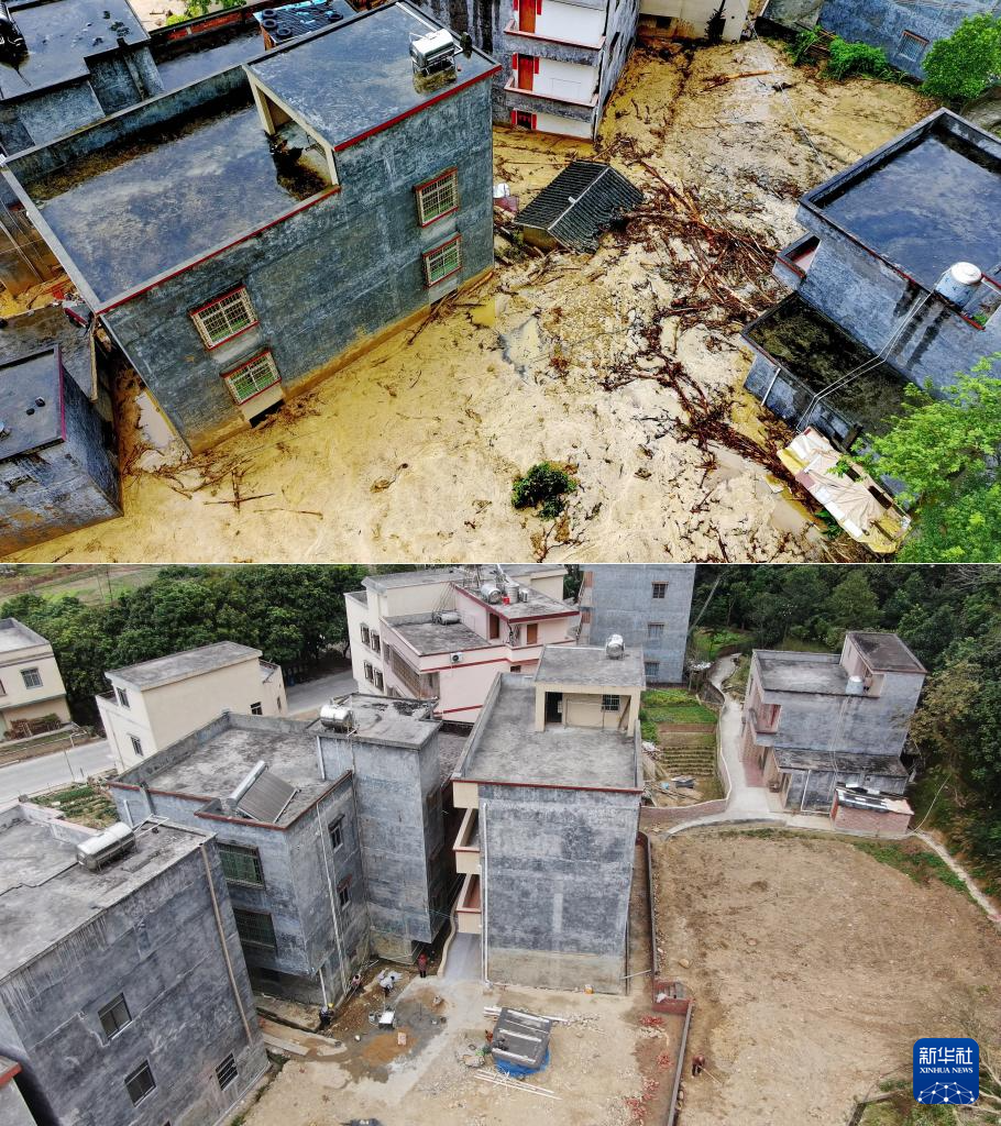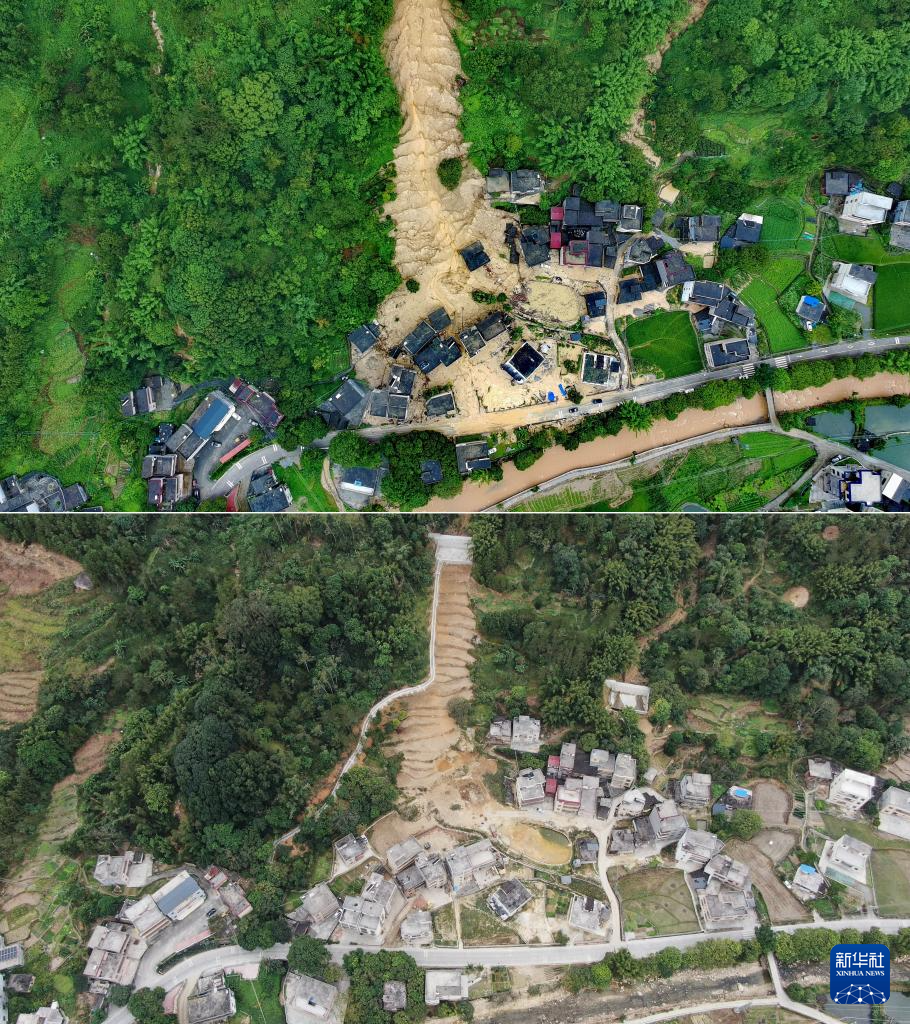 拼版照片:上图为6月17日中和村山体滑坡后的景象(新华社记者肖恩楠摄);下图为12月25日拍摄的中和村景象(新华社记者王瑞平摄)。