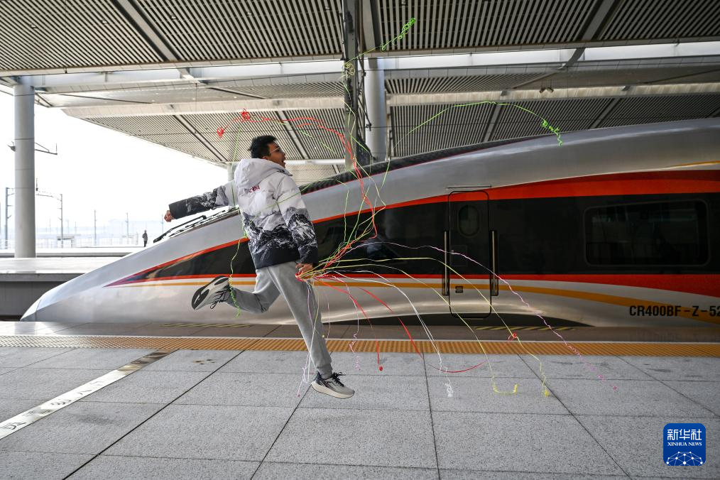 12月26日,在西安北站,一名乘客在西延高铁首发C9312次列车前庆祝。