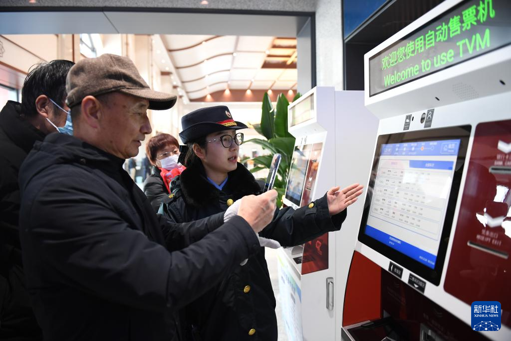 12月26日,西延高铁富平南站工作人员指导乘客使用无人售票机。