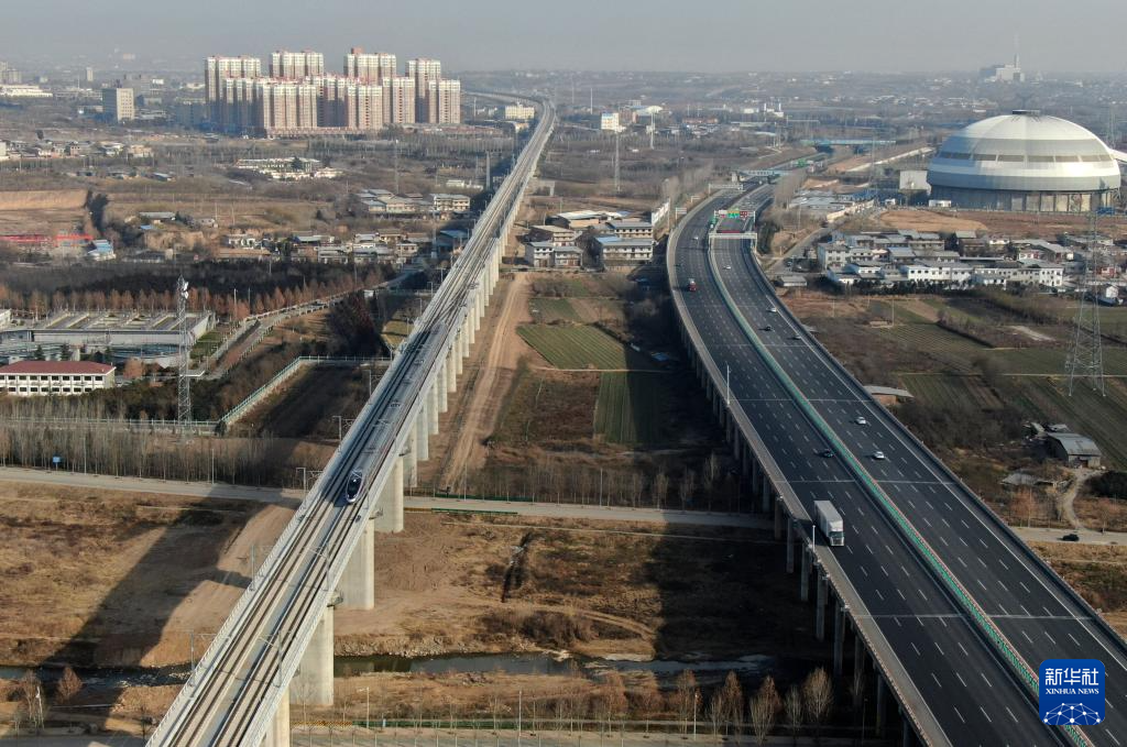 12月26日,西安开往延安的西延高铁列车驶过富平特大桥(无人机照片)。