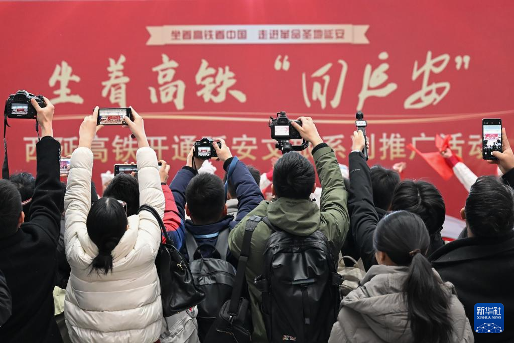 12月26日,媒体记者在西安北站采访拍摄西延高铁开通延安文旅系列推广活动。