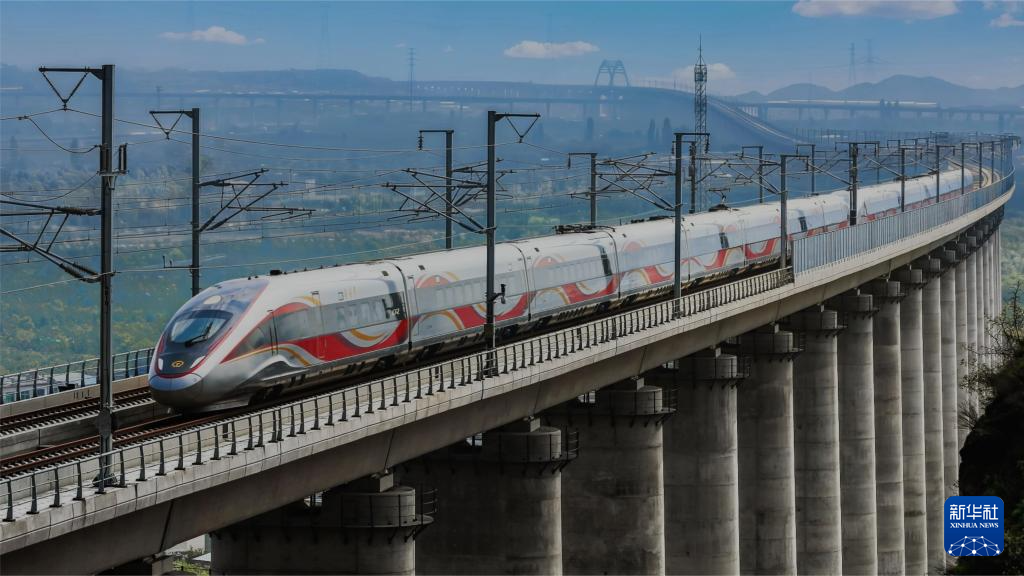 12月26日,列车驶过西延高铁王家河特大桥(无人机照片)。