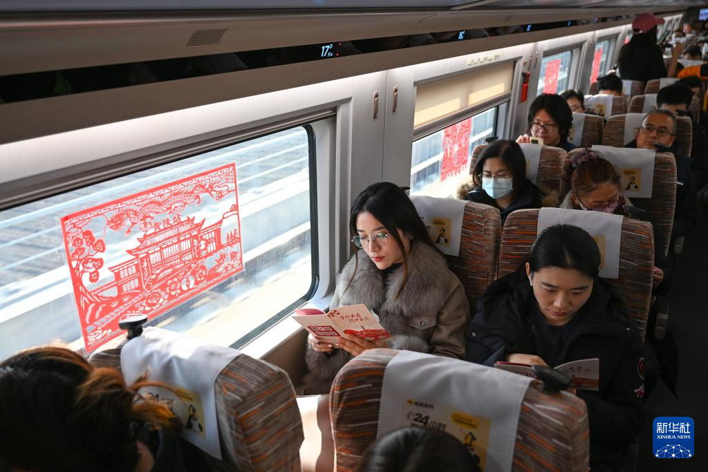 12月26日,乘客在西安北至延安C9312次列车上阅览延安文化推广手册。