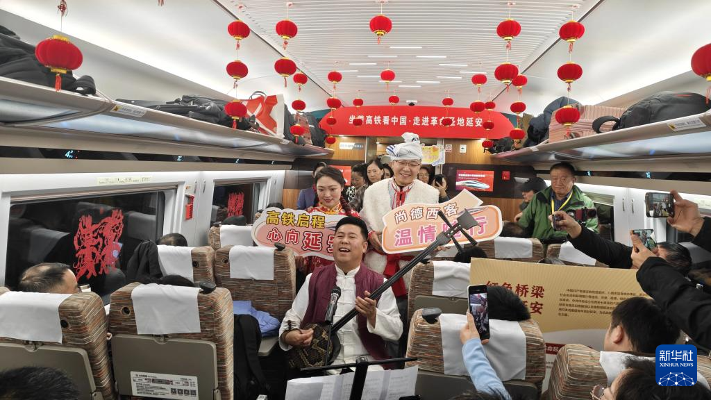 12月26日,演员在延安开往西安首发列车上表演节目。