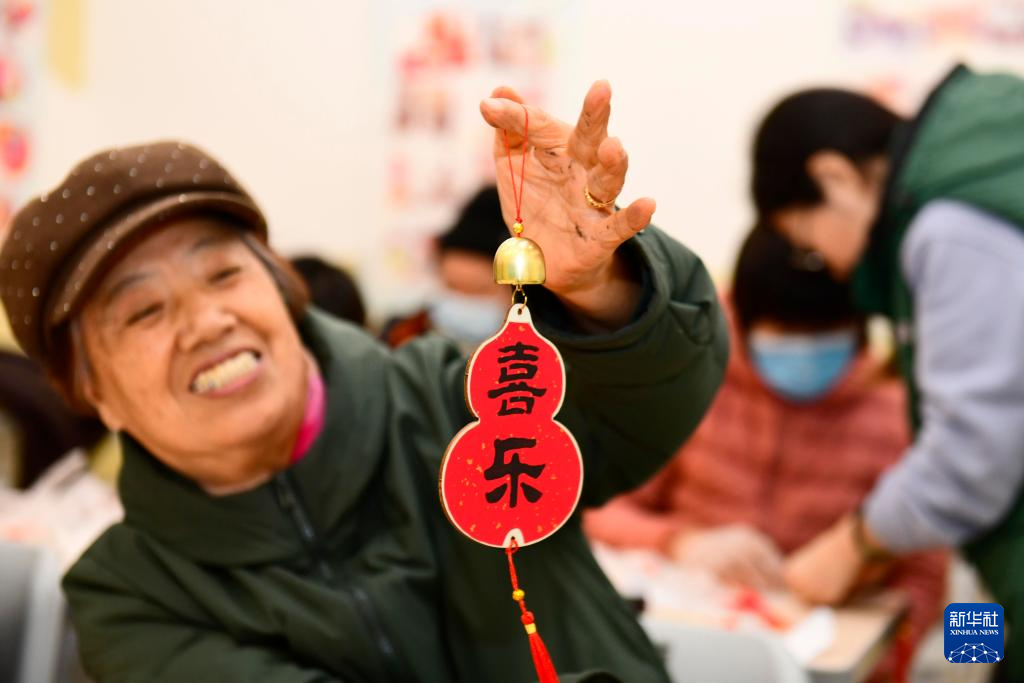 12月25日,在威海市“阅伴新华”文化书院,社区居民展示自己制作的拓印风铃。
