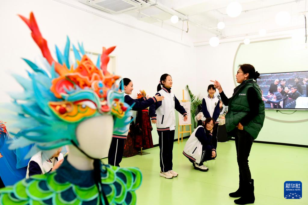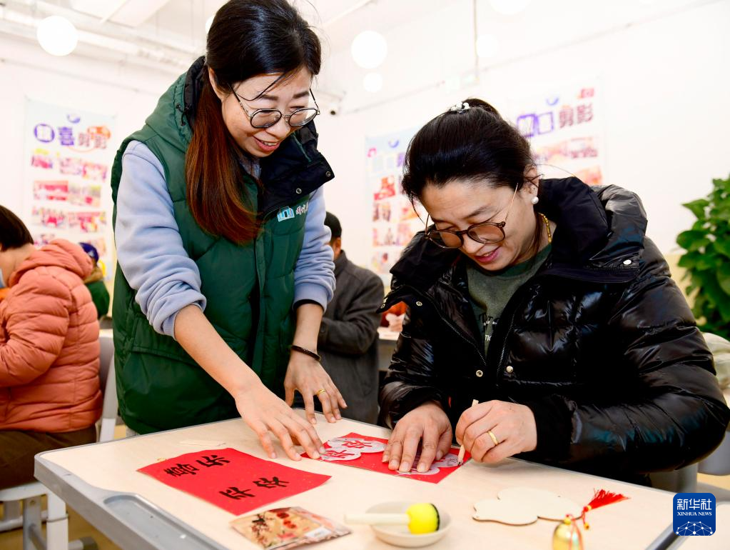 12月25日,在威海市“阅伴新华”文化书院,“阅伴新华”老师姚瑶指导社区居民制作拓印风铃。