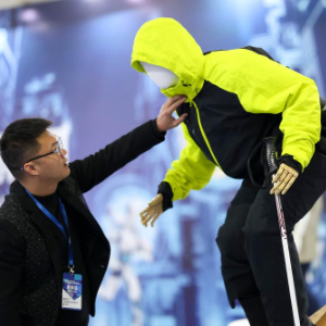 12月26日,工作人员整理展示服装的智能模特架。