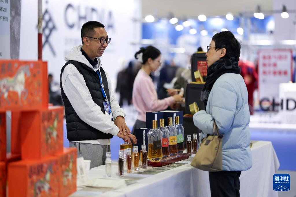 12月26日,展商(左)为观众介绍黄酒。