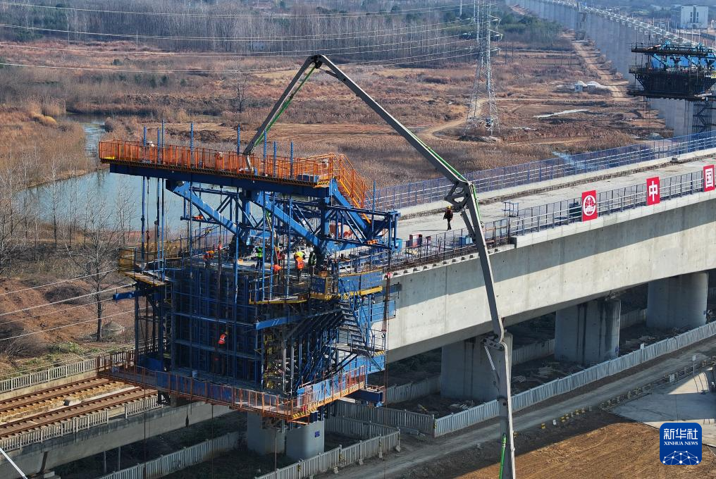 这是沪宁合高铁跨京沪高铁立交特大桥T构转体梁主体浇筑施工现场(12月27日摄,无人机照片)。