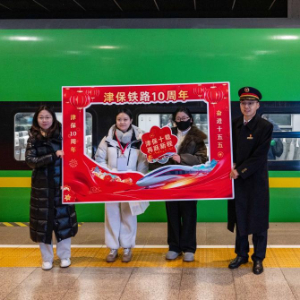 12月27日,乘客与乘务员在站台上合影,纪念津保铁路开通运营十周年。
