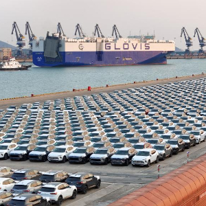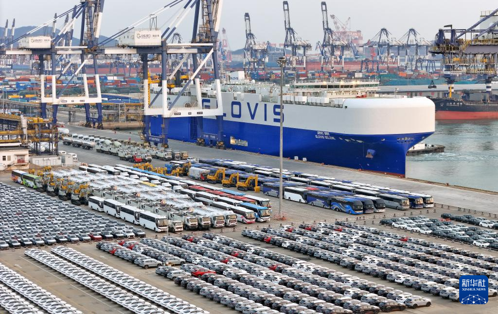 12月27日,大批国产汽车在山东港口烟台港等待装船出口(无人机照片)。