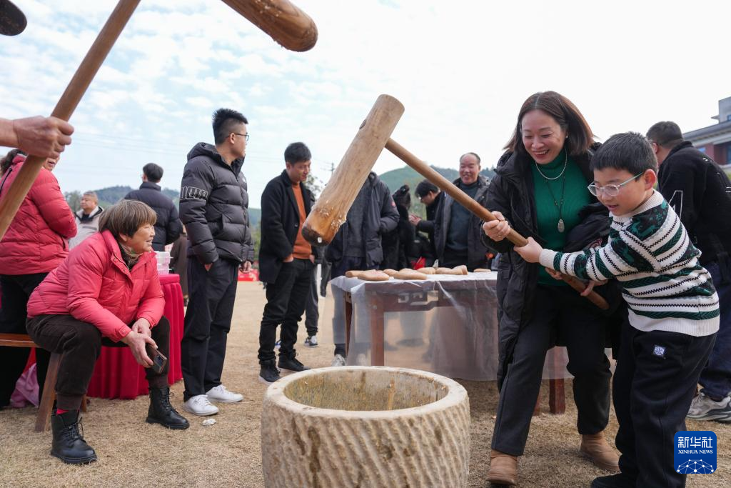 12月27日,游客在妙西镇龙山村与村民一起打年糕。