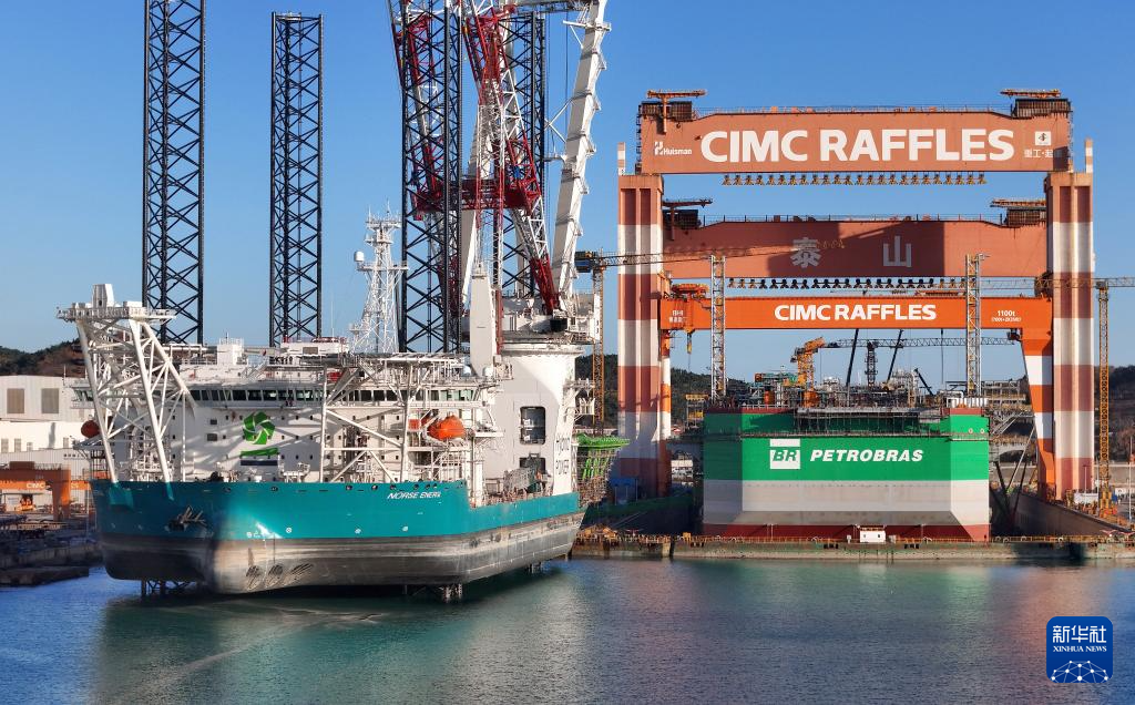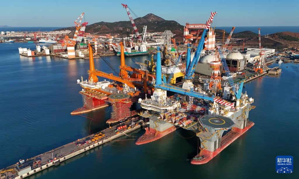12月24日,在中集来福士山东烟台建造基地,海工装备在进行建造作业(无人机照片)。