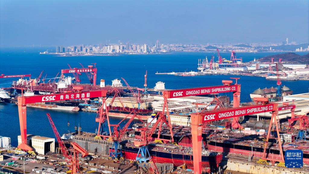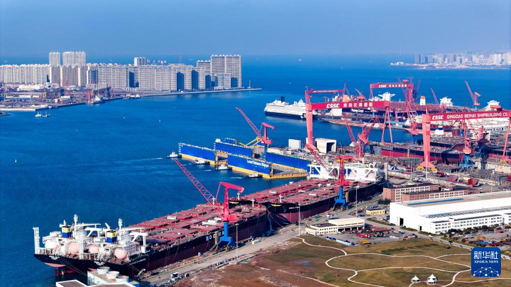 12月24日,在青岛海西湾船舶与海洋工程产业基地,中船北海造船在建造大型船舶(无人机照片)。