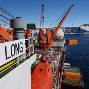 北京时间12月29日,执行中国第42次南极考察任务的“雪龙”号极地科考破冰船顺利抵达秦岭站海域,并开展卸货作业。本次卸运物资总重量约1400吨,包括秦岭站后勤保障物资、工程物资、科研物资和油料。物资将通过驳船卸运上站。