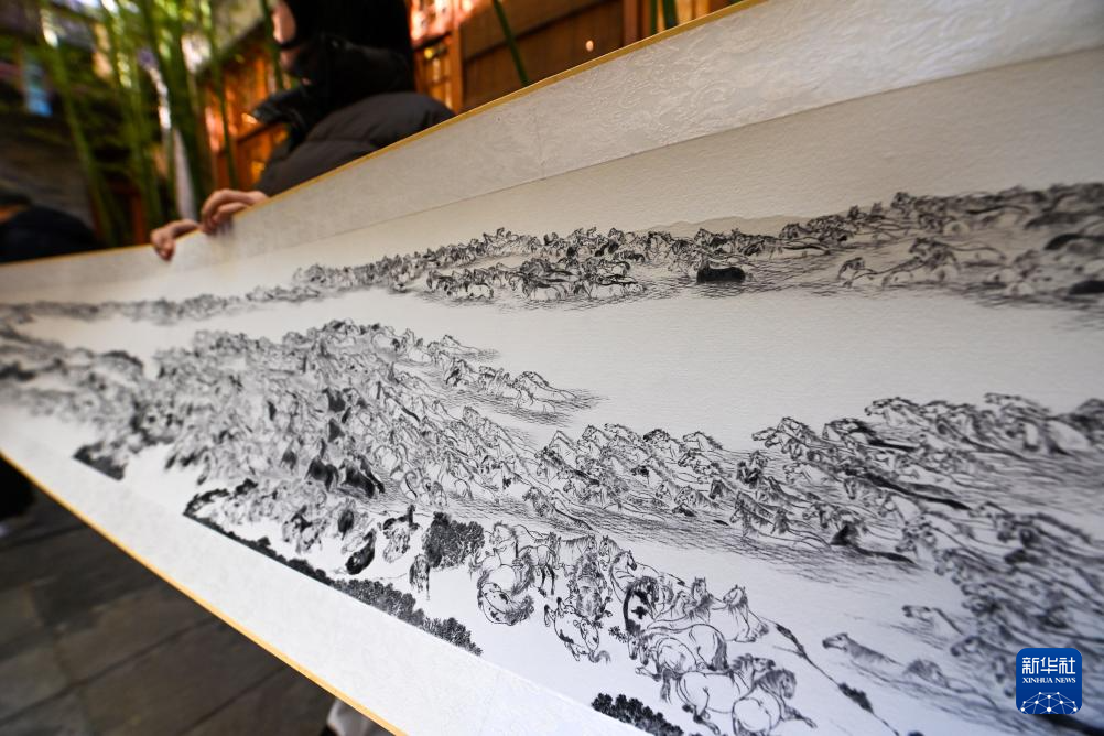 12月29日,参观者在天津古文化街参观“喜迎马年,五代画马人马画艺术展”。