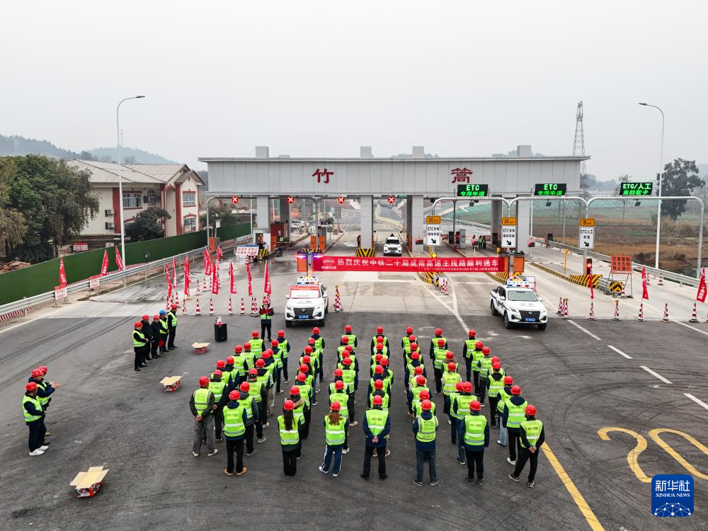 12月30日,在成南高速扩容工程竹篙收费站,中铁二十局的建设者举行仪式庆祝即将通车(无人机照片)。