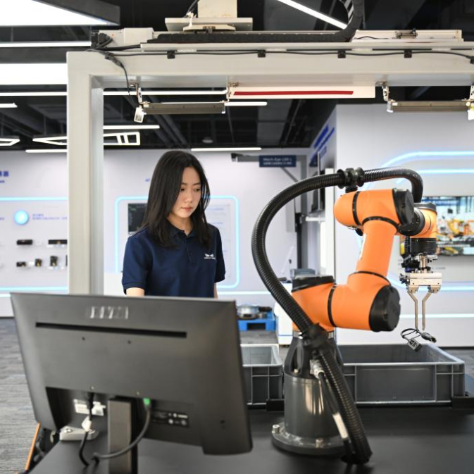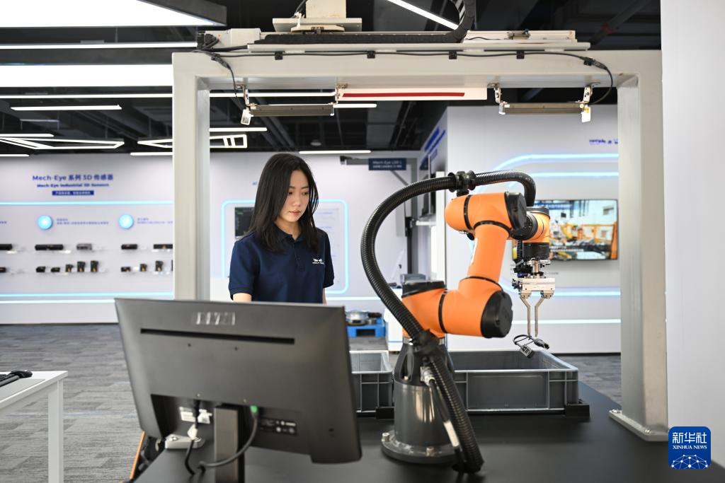 2025年3月26日,在雄安新区中关村科技园,梅卡曼德(北京)机器人科技有限公司工作人员在演示工业机器人运行。雄安新区中关村科技园是中关村“试验田”在雄安的创新实践,目前已汇聚科创企业200余家。