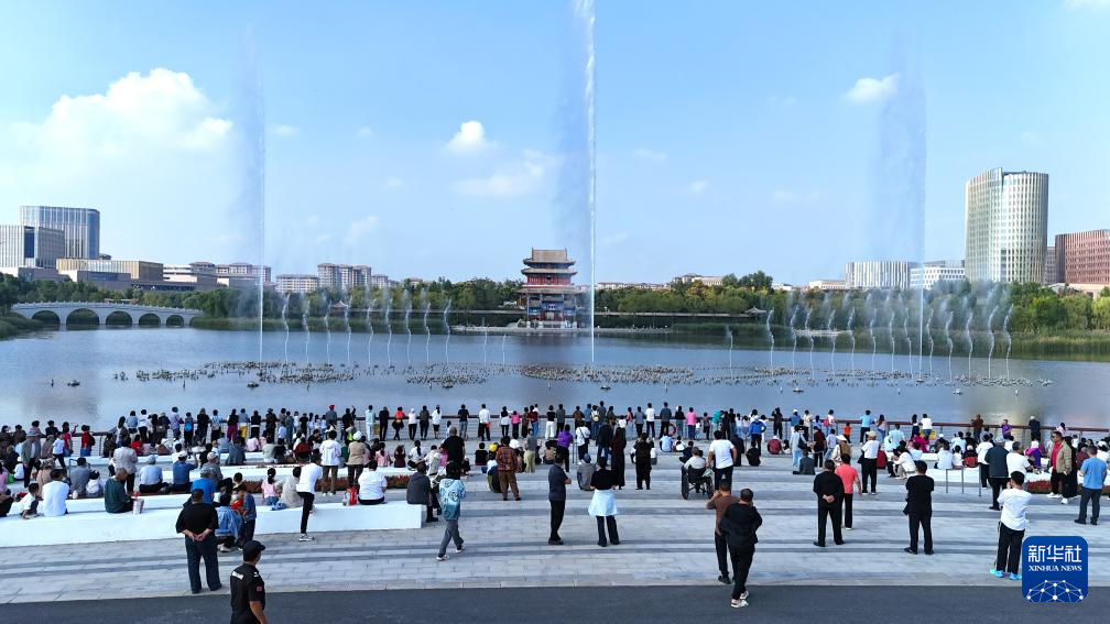市民和游客在雄安新区金湖公园内游览(2025年10月3日摄,无人机照片)。
