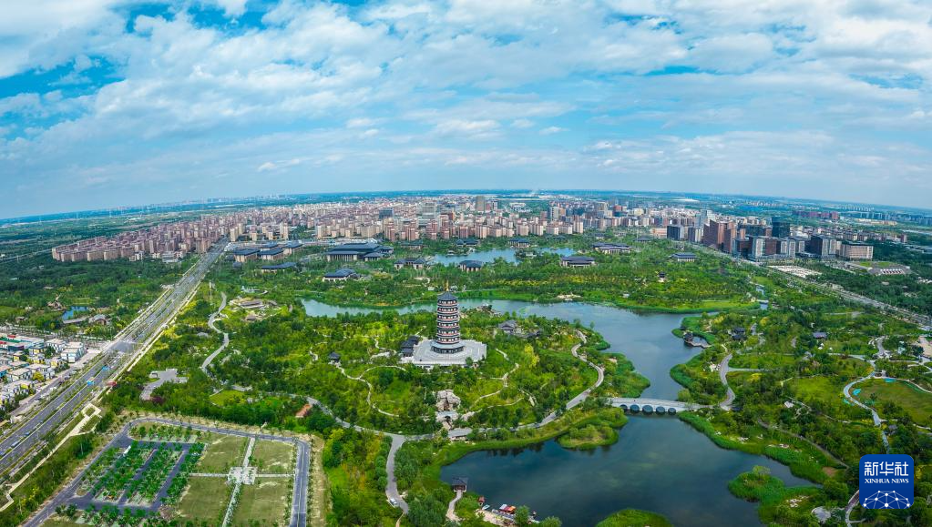 雄安新区启动区内树木葱郁(2025年8月9日摄,无人机照片)。雄安新区启动区规划面积38平方公里,是先行开发、率先见效的关键区域。启动区承担着首批北京非首都功能疏解项目落地、高端创新资源集聚和引领高质量发展的重要任务。