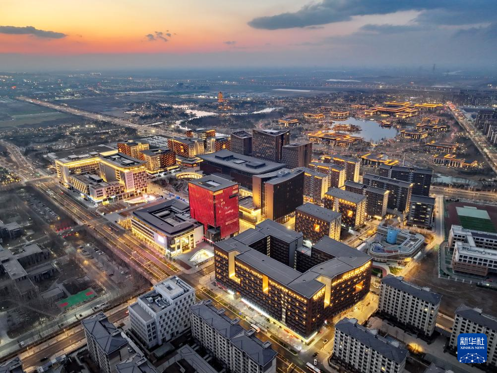 雄安商务服务中心夜景(2025年3月15日摄,无人机照片)。雄安商务服务中心是雄安新区首个标志性城市建筑群,其朱红墙体、灰色飞檐的建筑彰显中式特色。