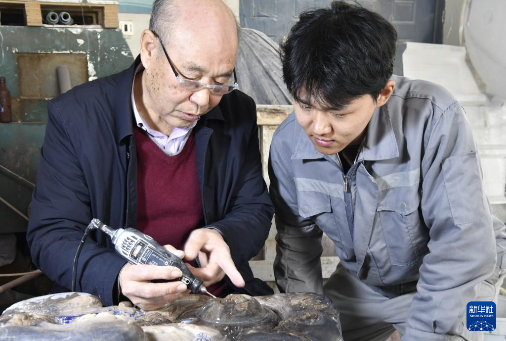 中国工艺美术大师宋建国(左)在大兴区的玉雕工作室内为学生讲解玉雕技艺(12月26日摄)。