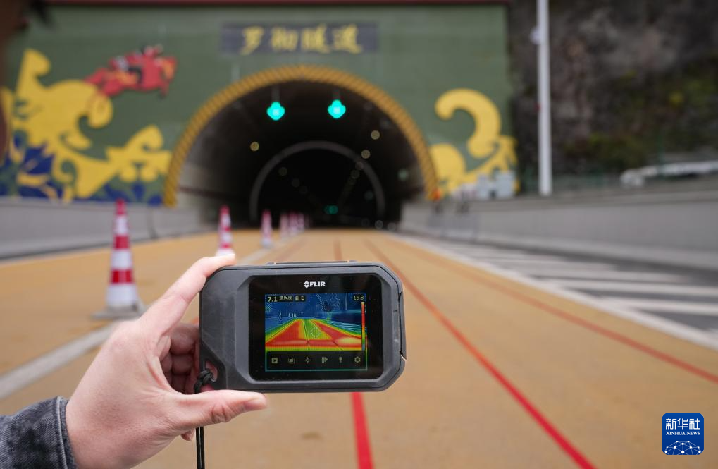 12月26日,工作人员用热成像仪测试乐西高速罗彻隧道口使用环路热管融雪系统效果,结果显示该路面温度明显高于其他地方。